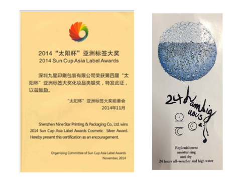 標簽行業(yè)極具影響力的2014“太陽杯”亞洲標簽大獎頒獎盛典,近日在上海舉行。九星印刷選送作品“NS 24小時高效補水面霜標簽”榮獲化妝品類銀獎。