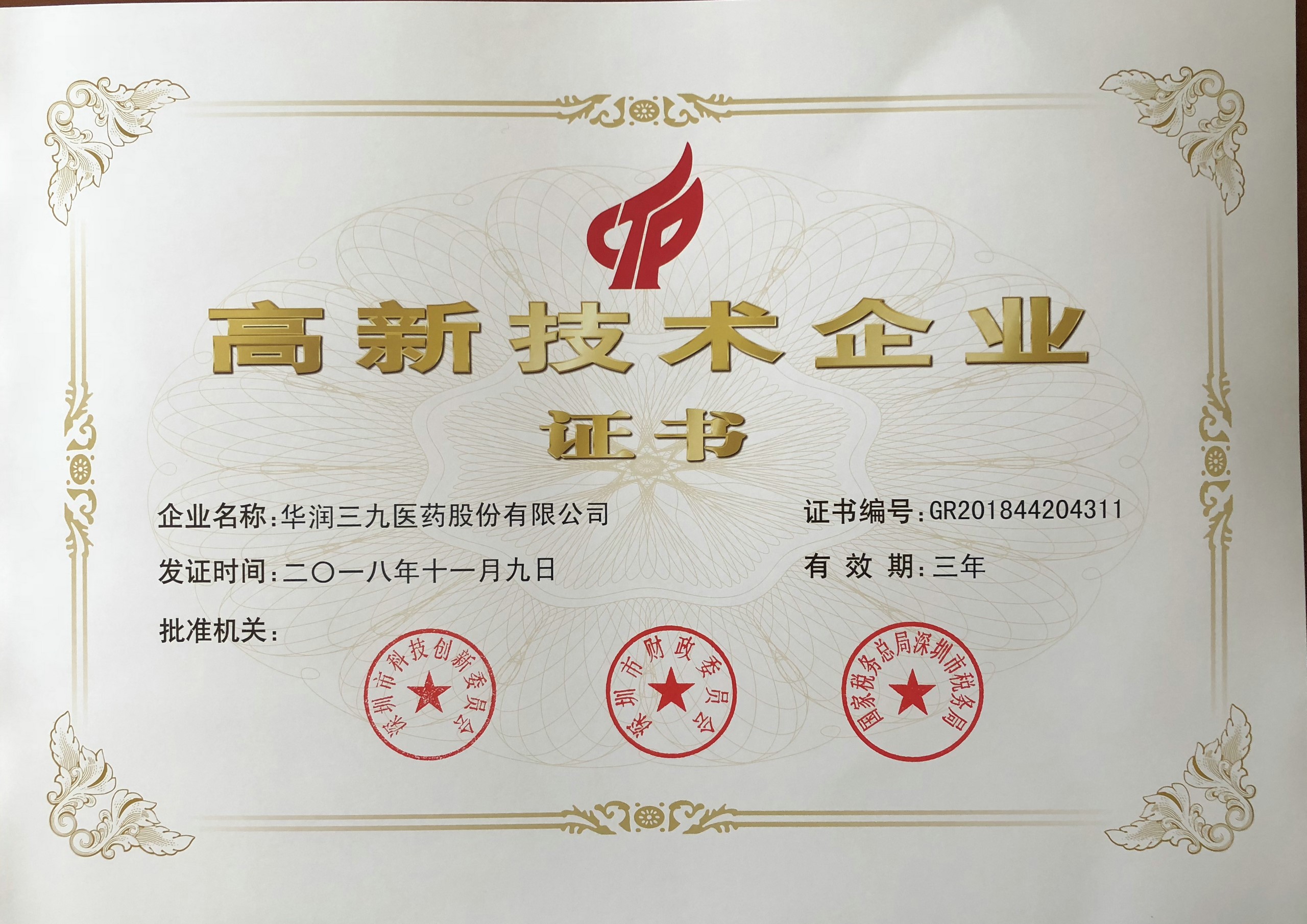 3月14日,華潤三九收到深圳市科技創(chuàng)新委員會、深圳市財政委員會、國家稅務(wù)總局深圳市稅務(wù)局聯(lián)合頒發(fā)的《高新技術(shù)企業(yè)證書》(證書編號:GR201844...