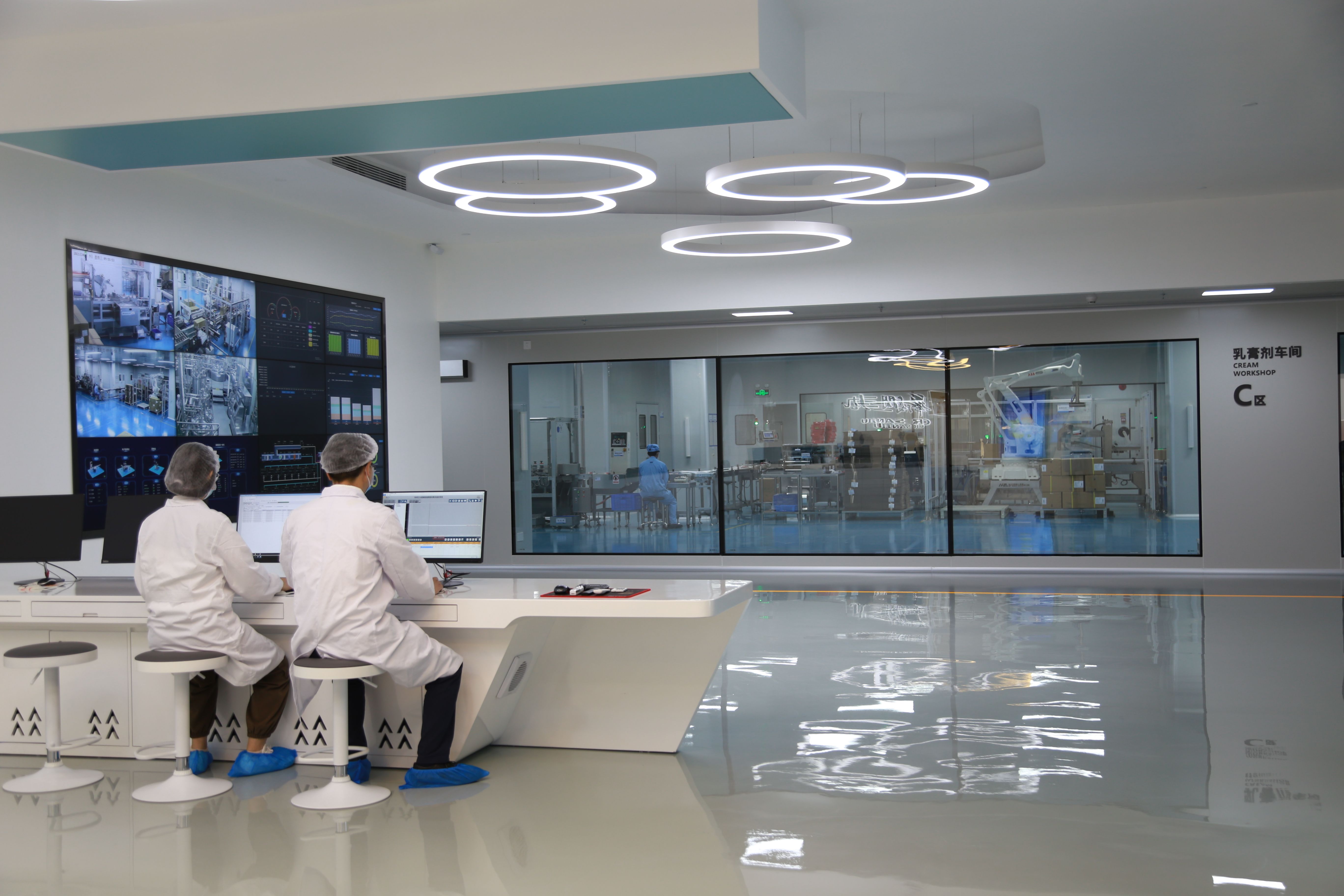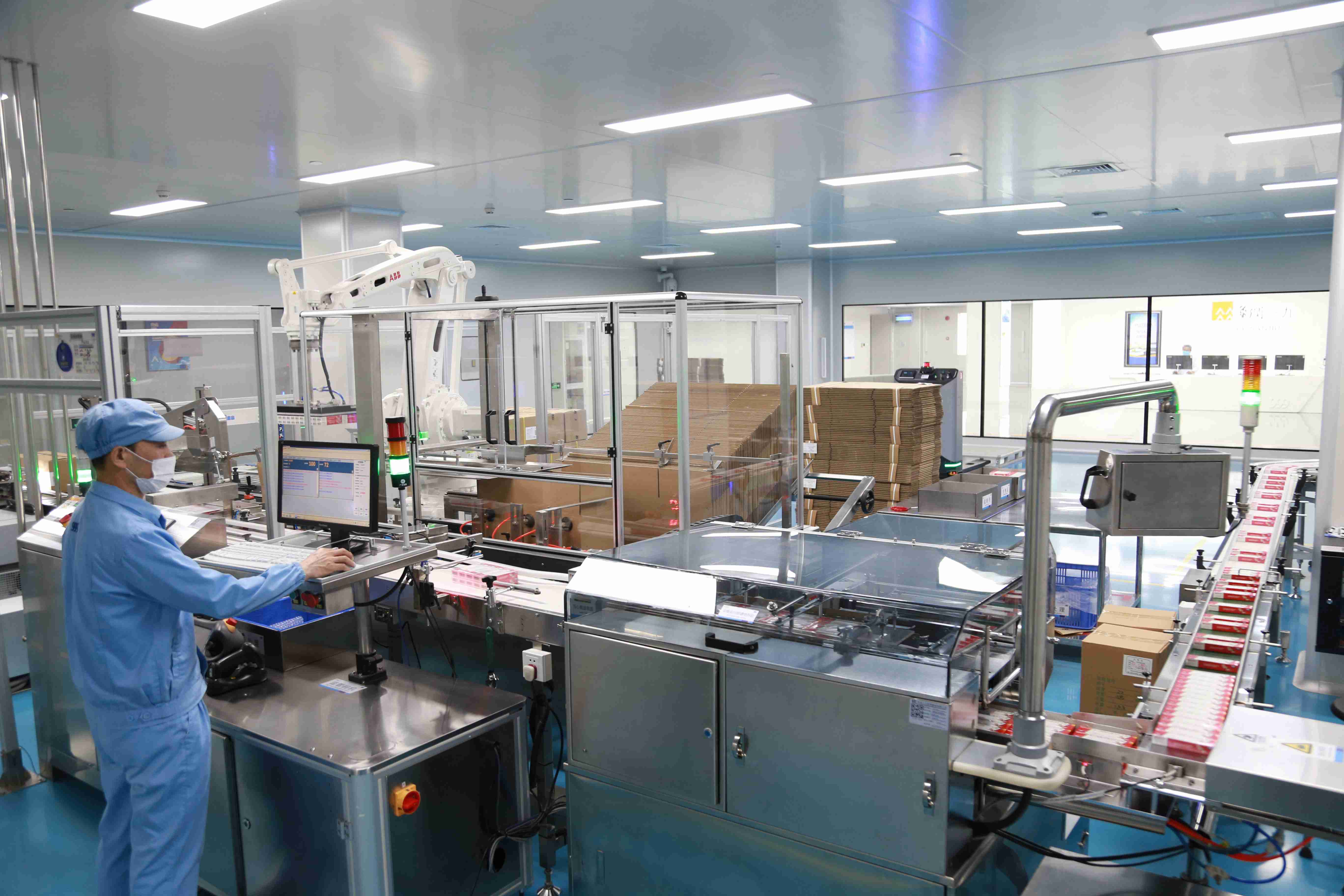 走進華潤三九觀瀾生產(chǎn)基地的智能制造中控中心,記者從監(jiān)控大屏看到,自動化生產(chǎn)設備排列有序,高效運轉(zhuǎn);國內(nèi)潔凈區(qū)首條AGV運輸線來回穿梭,各種原料源源不斷被運回;偌大的制藥車間,幾乎看不到工人。