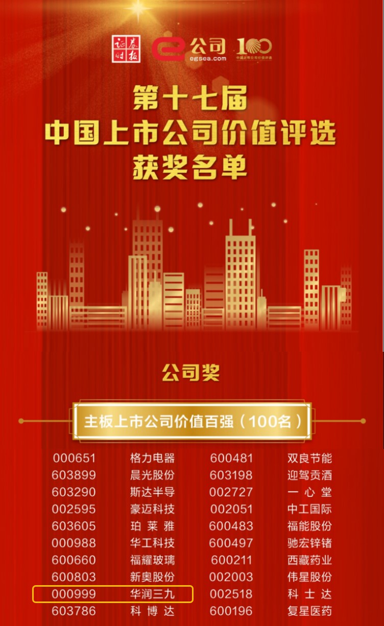 了解更多>>>華潤三九獲評第十七屆中國主板上市公司“價值百強”