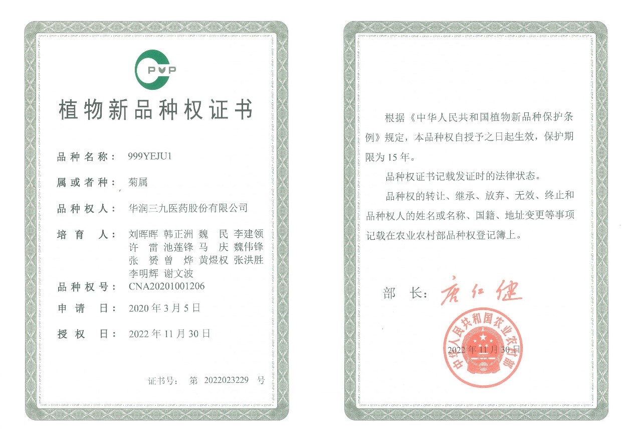 了解更多>>>華潤三九野菊花新品種獲植物新品種權證書