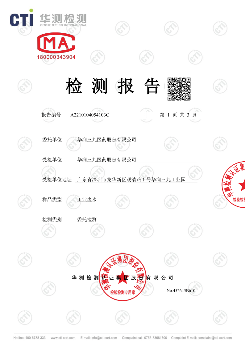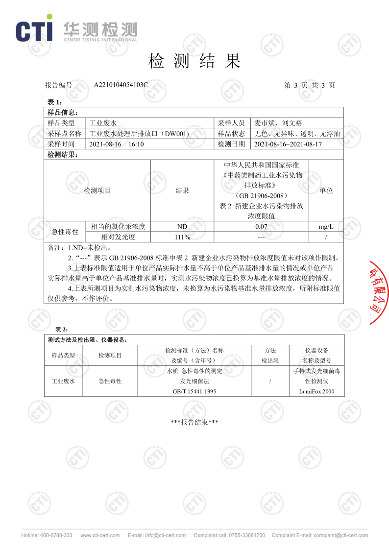 華潤(rùn)三九廢水檢測(cè)報(bào)告(2021年8月毒性)