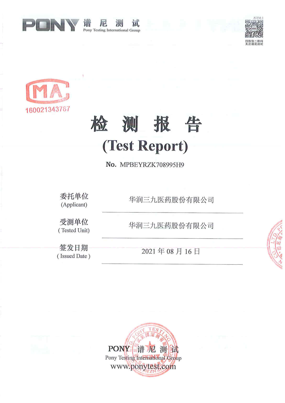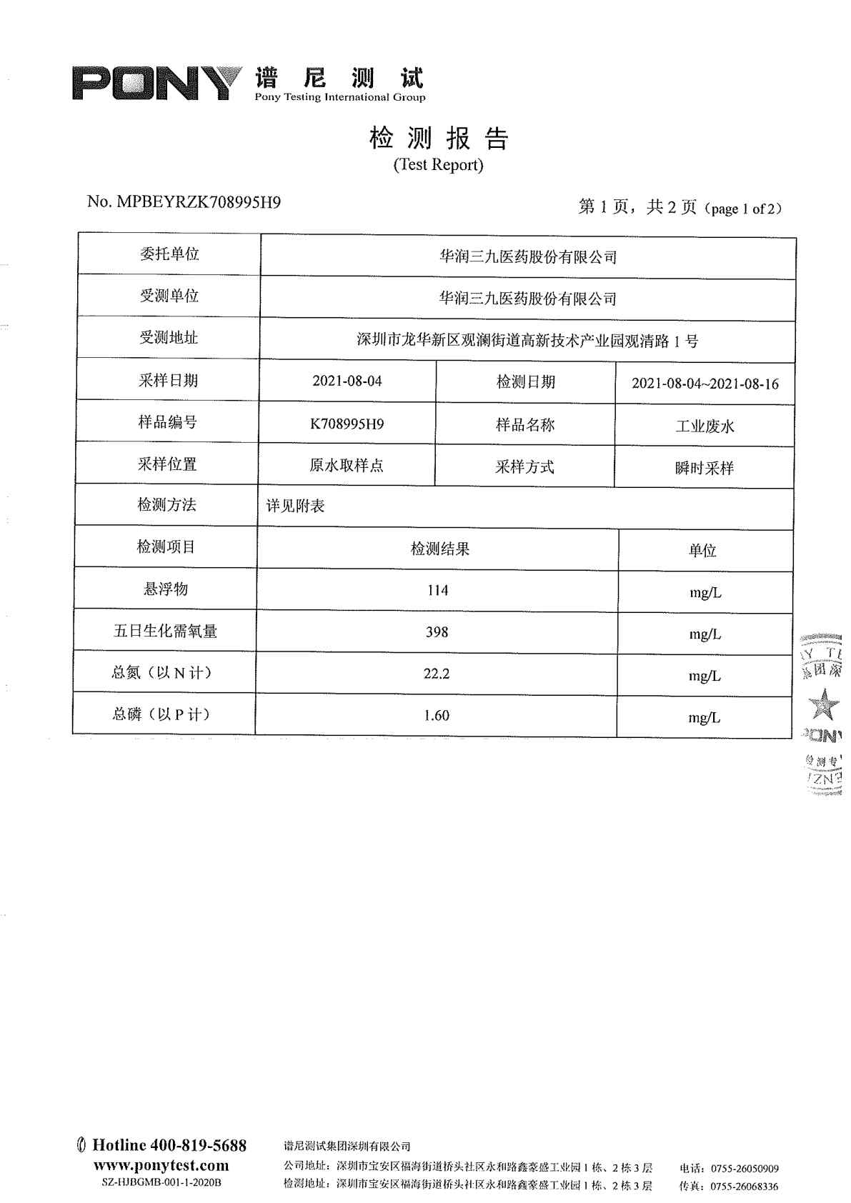 華潤(rùn)三九廢水檢測(cè)報(bào)告(2021年8月原水)