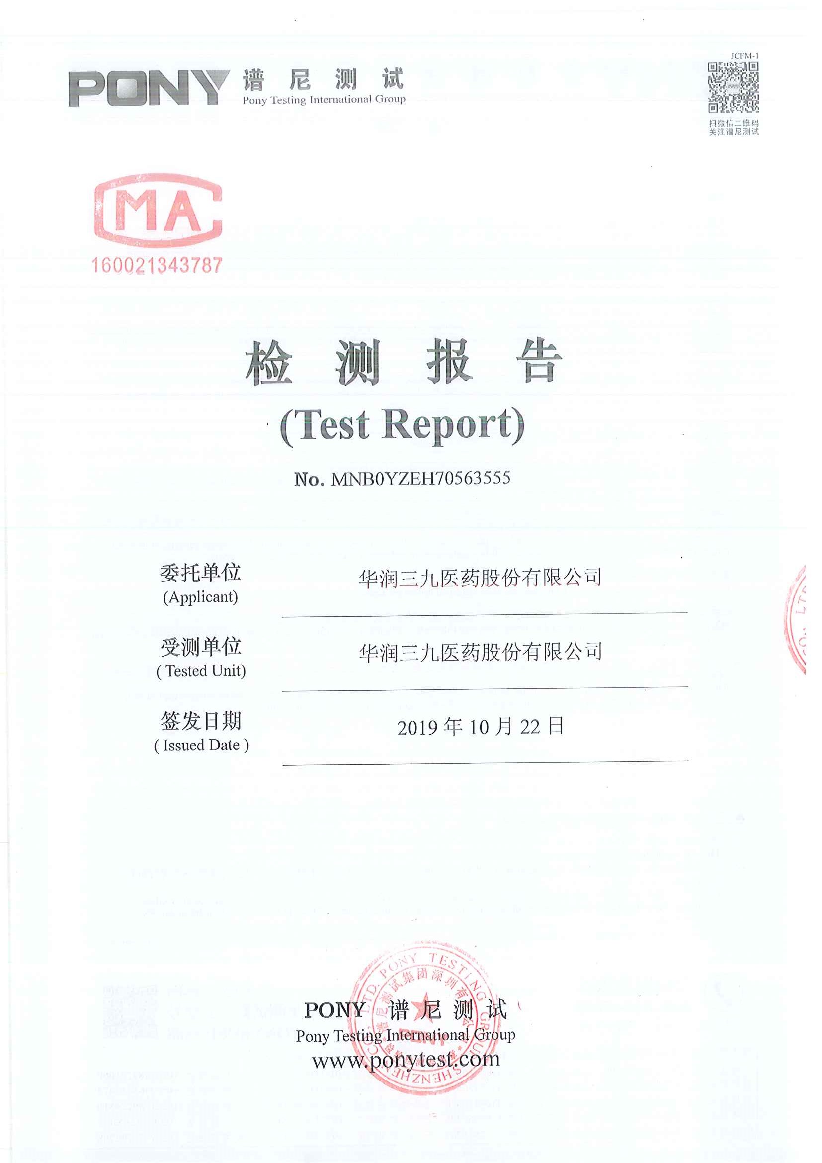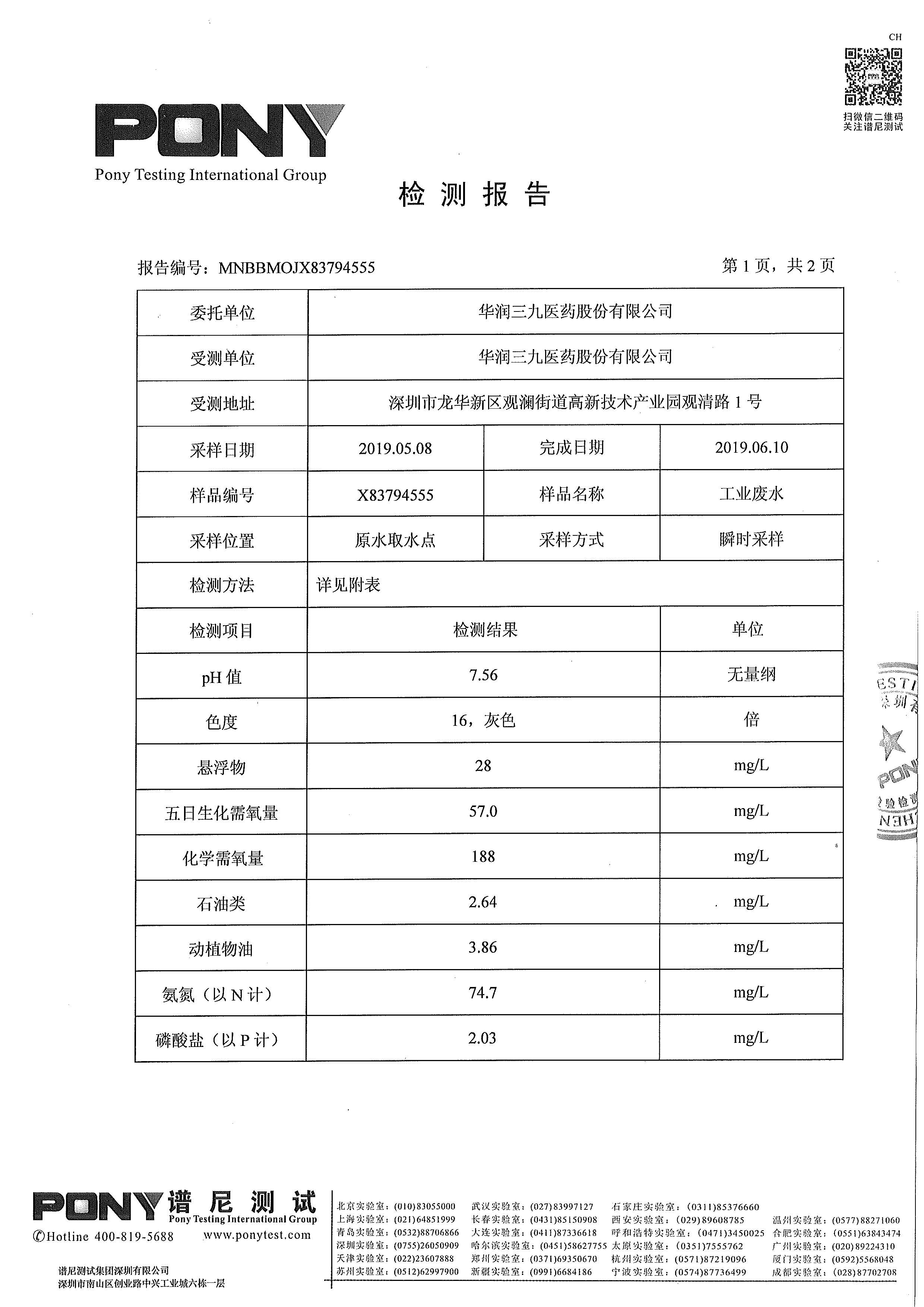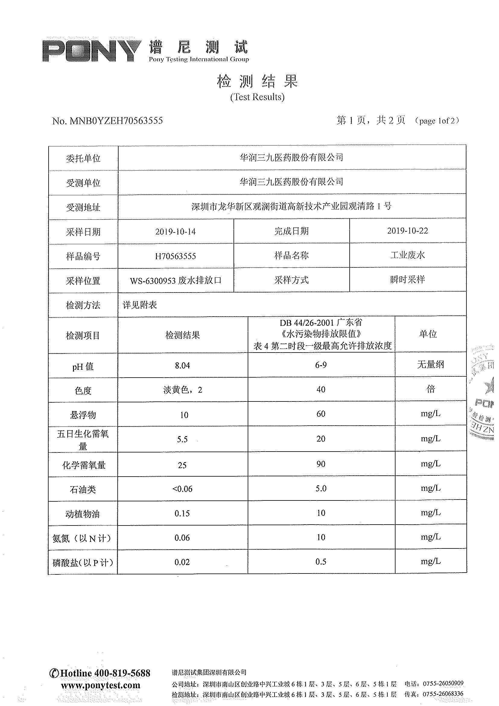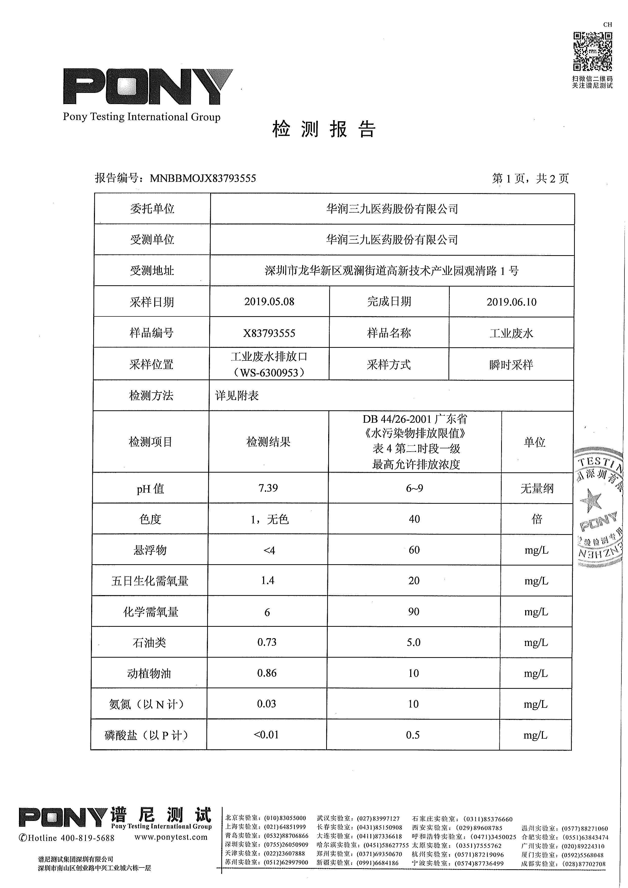 華潤三九廢水檢測報告(2019年10月)