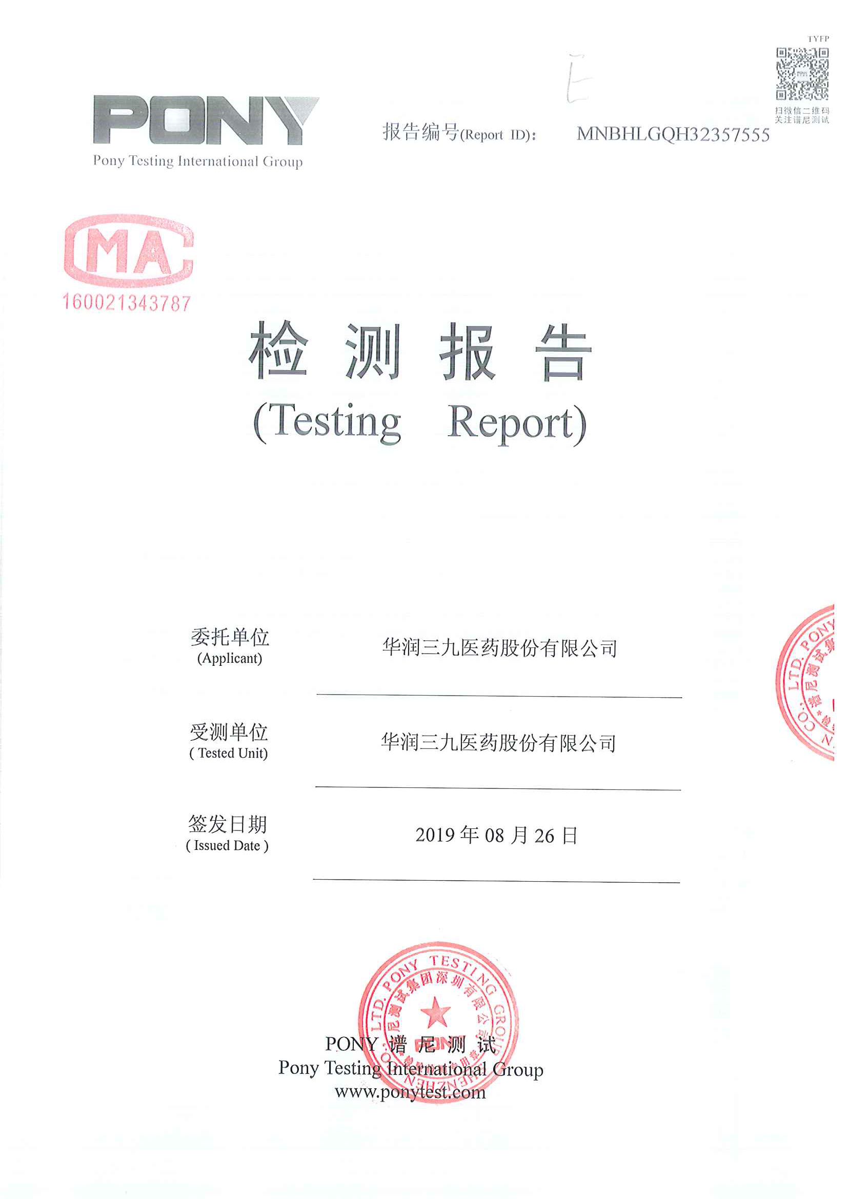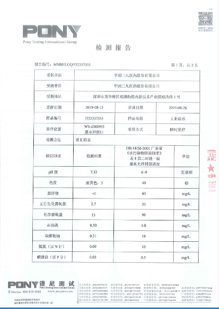 華潤三九廢水檢測報告(2019年8月)