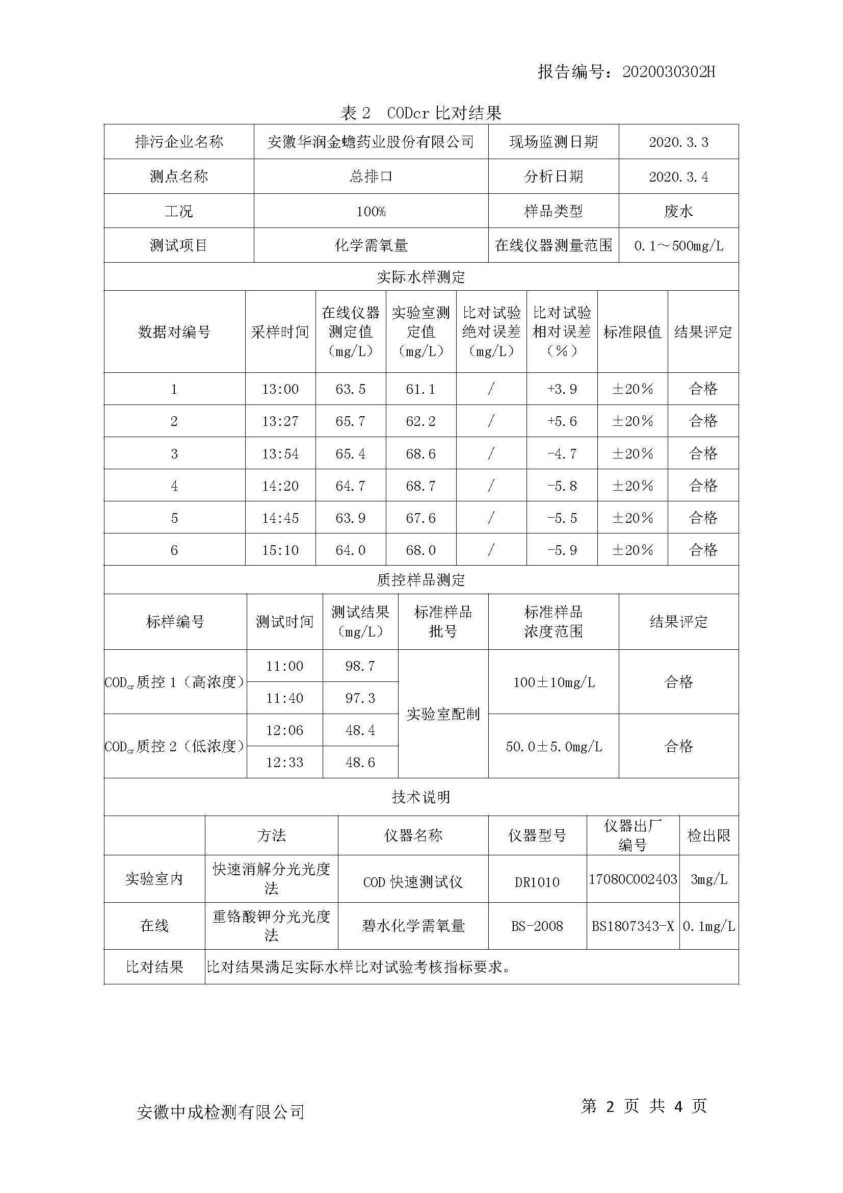 華潤金蟾污染物排放檢測報告(2020年一季度)