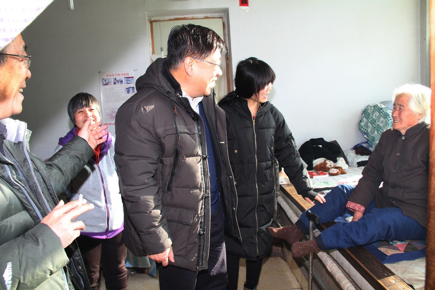 馮毅主席一行首先來到延慶區(qū)廣積屯村,走進華潤高科員工聶玉榮的家,馮毅主席親切握著聶玉榮的手說:今天我代表華潤醫(yī)藥在春節(jié)到來前,看望您們?nèi)?,祝全家人健康幸福。聶玉榮及患病的愛人深表感謝領(lǐng)導(dǎo)的關(guān)懷和照顧。馮毅主席看到在炕上的80多歲老婆婆,關(guān)切的詢問老人家身體狀況,當(dāng)?shù)弥抑杏袃晌徊∪耍畠哼€在上學(xué),全家僅靠聶玉榮一人收入生活時,馮總鼓勵聶玉榮要堅強的面對生活壓力,照顧好家中病人和女兒,他叮囑高科工會的同志要多關(guān)注困難員工的生活,多幫助他們解決后顧之憂。隨后,馮毅主席又來到華潤高科雙職工賀玉蓮、張愛利家中,看望重病的賀玉蓮,了解到賀玉蓮的病情后,馮毅主席鼓勵她要有信心要堅強,積極治療,早日康復(fù)。華潤高科總經(jīng)理助理方玲、工會主席朱琦、后勤部部長王建新隨同慰問。