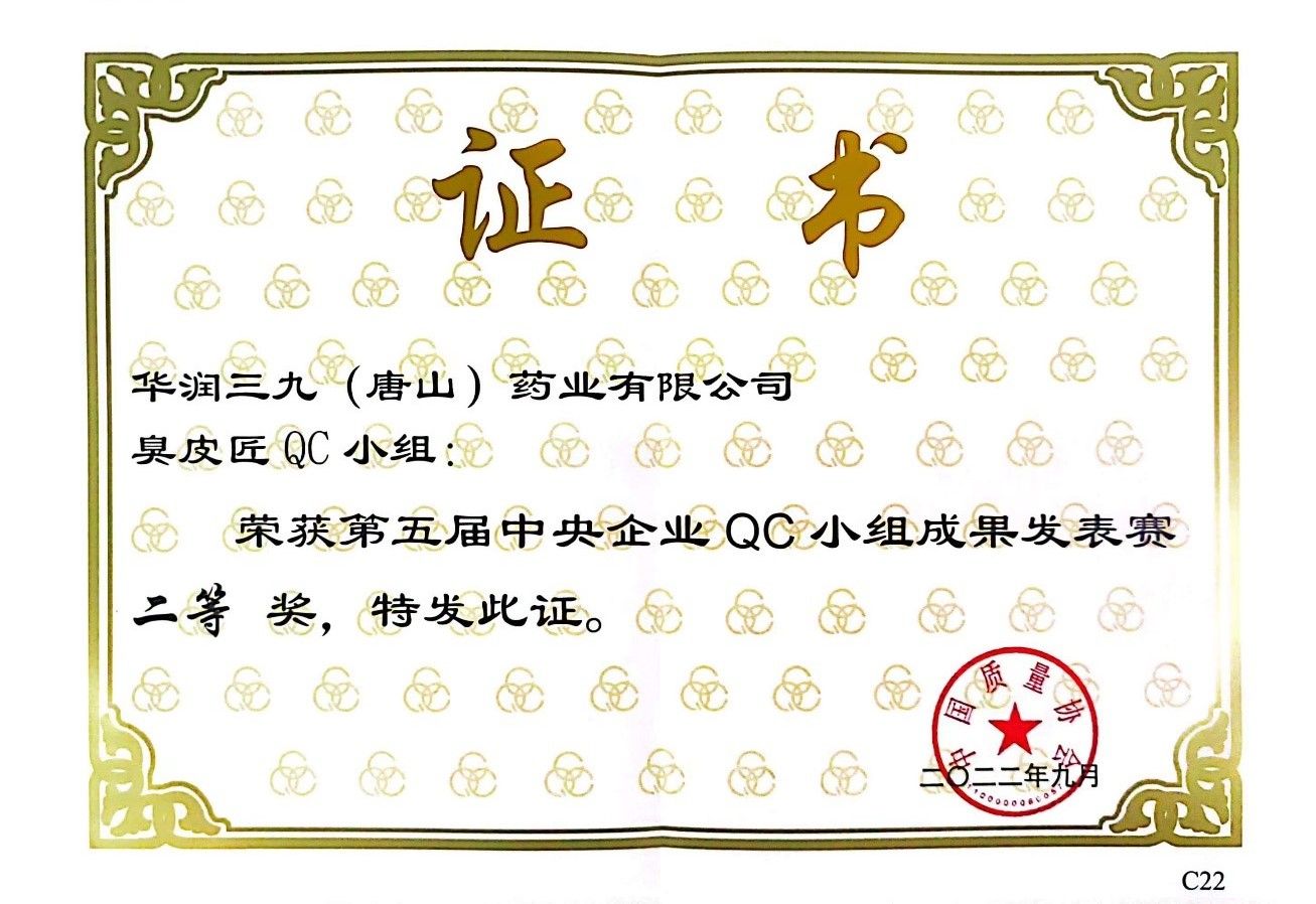 華潤三九(唐山)QC小組課題榮獲第五屆中央企業(yè)QC小組比賽二等獎