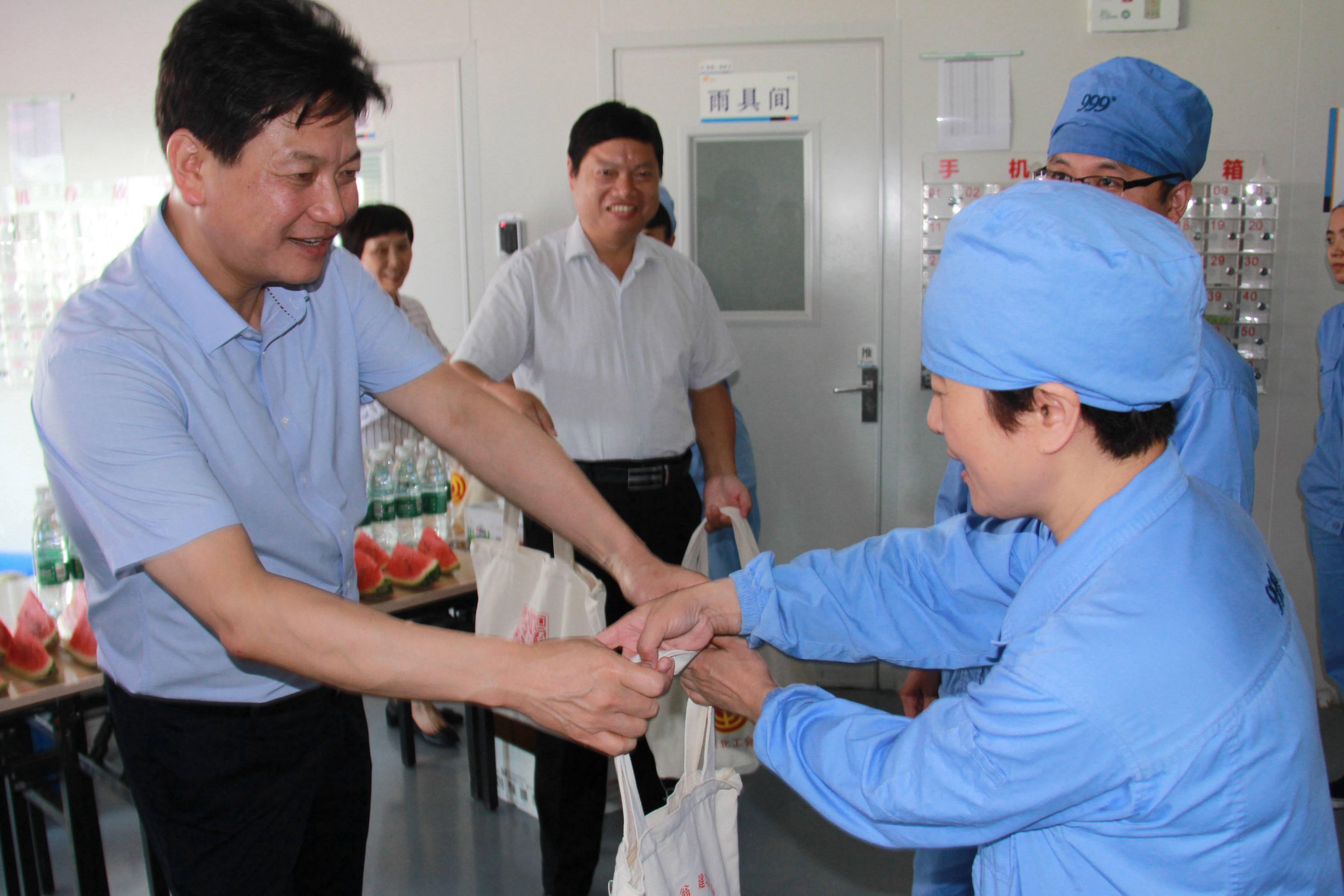 7月31日上午,淮北市委副書(shū)記李明,市人大常委會(huì)副主任、市總工會(huì)主席李曉光一行,來(lái)到安徽華潤(rùn)金蟾藥業(yè)股份有限公司,開(kāi)展“暑期送清涼”慰問(wèn)活動(dòng),慰問(wèn)在高溫下堅(jiān)守生產(chǎn)崗位的一線職工。