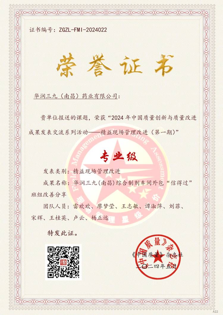 華潤(rùn)三九(南昌)綜合制劑車(chē)間外包“信得過(guò)”班組榮獲中國(guó)質(zhì)量協(xié)會(huì)“專(zhuān)業(yè)級(jí)”榮譽(yù)