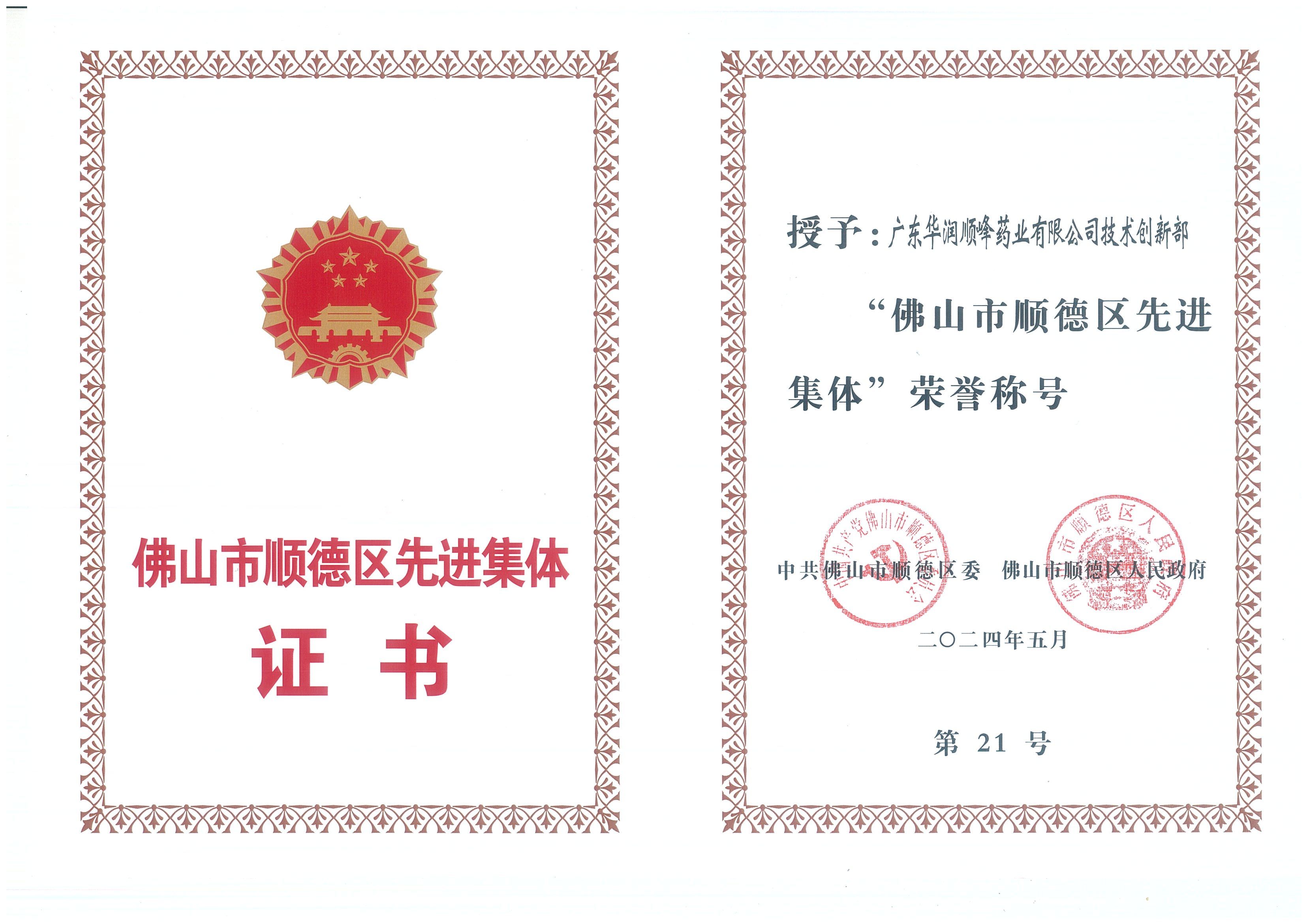 華潤順峰技術(shù)創(chuàng)新部榮獲佛山市順德區(qū)先進(jìn)集體榮譽(yù)稱號(hào)