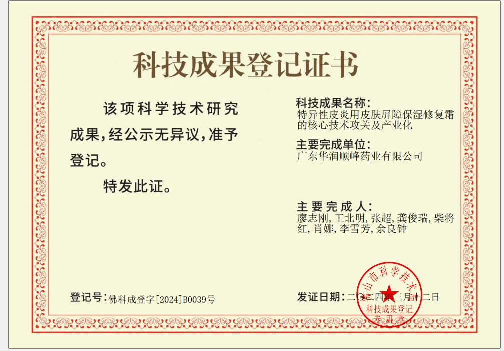 特異性皮炎用皮膚屏障保濕修復(fù)霜核心技術(shù)完成成果鑒定